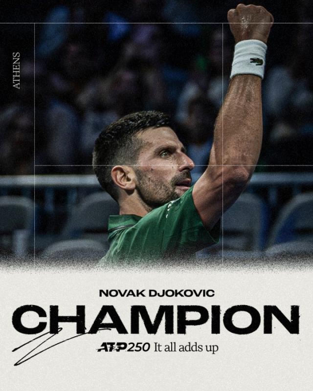 ATP250雅典站决赛,头号种子德约科维奇兑现第二个发球胜赛局,以4比6、6比3、7比5逆转二号种子穆塞蒂,对其取得6连胜,斩获本赛季第2座、职业生涯第101座巡回赛男单冠军。