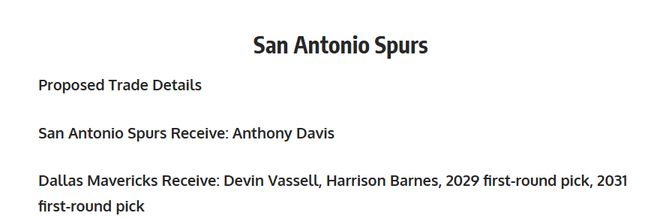 独行侠得到:德文・瓦塞尔、哈里森・巴恩斯、2029 年首轮签、2031 年首轮签