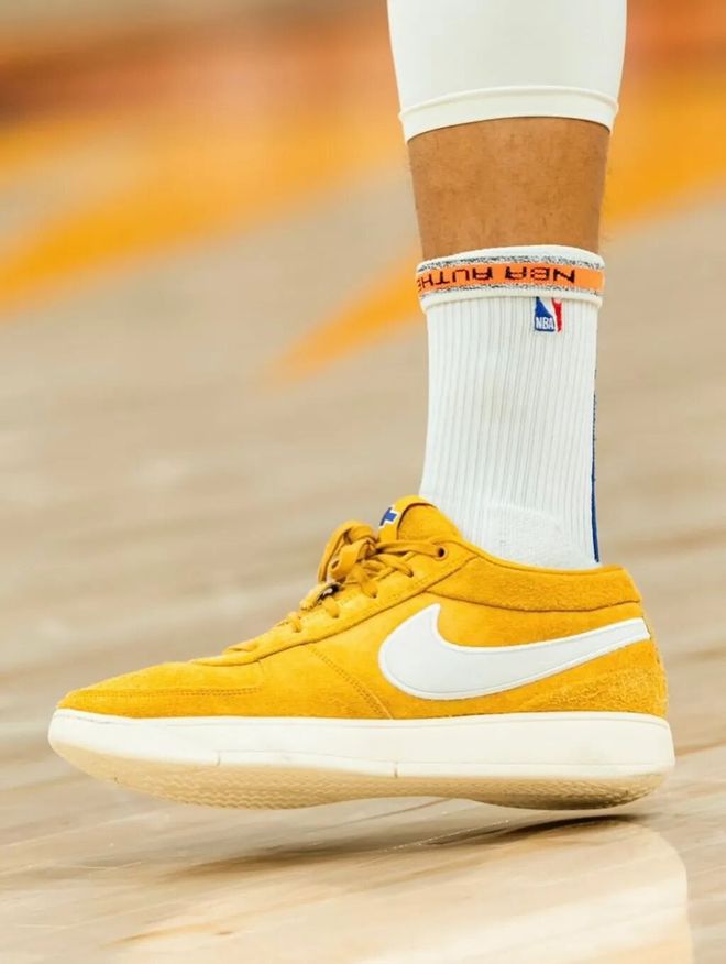 先是在热身时穿上了雪佛兰主题的配色,以姜黄色麂皮覆盖鞋面,复古气质拉满。