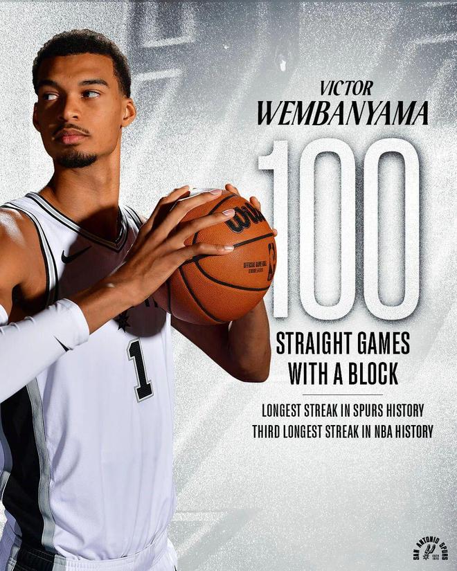 这两记盖帽之后,文班亚马还达成了一记纪录,他是NBA历史上第三位连续100场送出盖帽的球员,目前排在第一的是尤因的146场,文班亚马本赛季就有望实现超越。