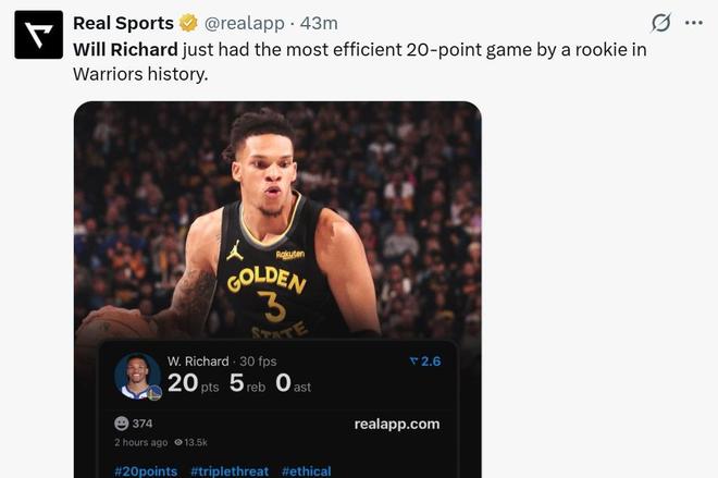本场理查德真实命中率高达114.3%,创造勇士队史新秀砍下20+得分场次效率最佳表现。